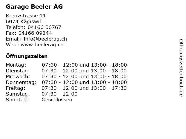 | Öffnungszeiten Garage Beeler AG in Kägiswil anzeigen | |