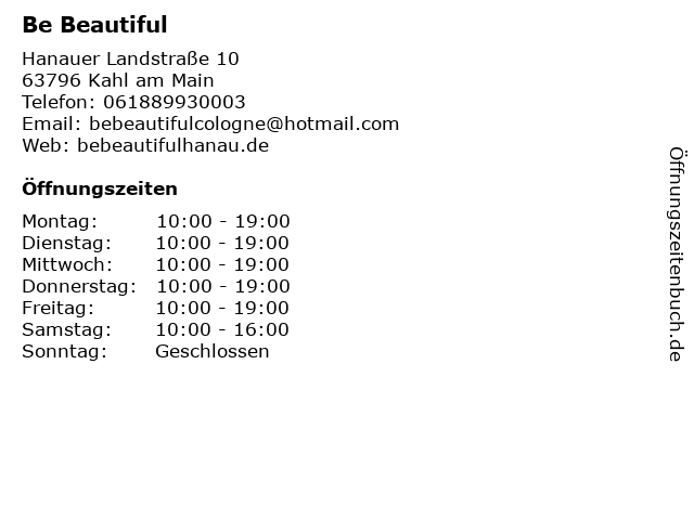 | Öffnungszeiten Be Beautiful in Kahl am Main anzeigen | |