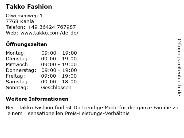 | Öffnungszeiten Takko Fashion in Kahla anzeigen | |