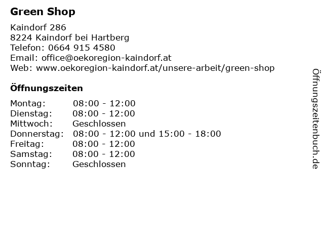 | Öffnungszeiten Green Shop in Kaindorf bei Hartberg anzeigen | |