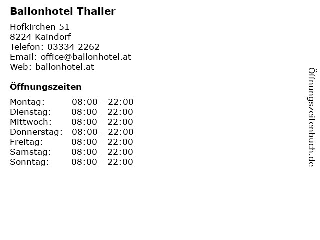 | Öffnungszeiten Ballonhotel Thaller in Kaindorf anzeigen | |