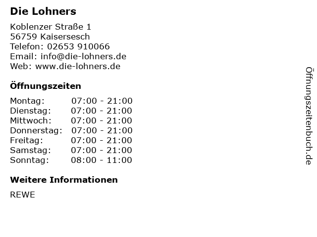 | Öffnungszeiten Die Lohners in Kaisersesch anzeigen | |