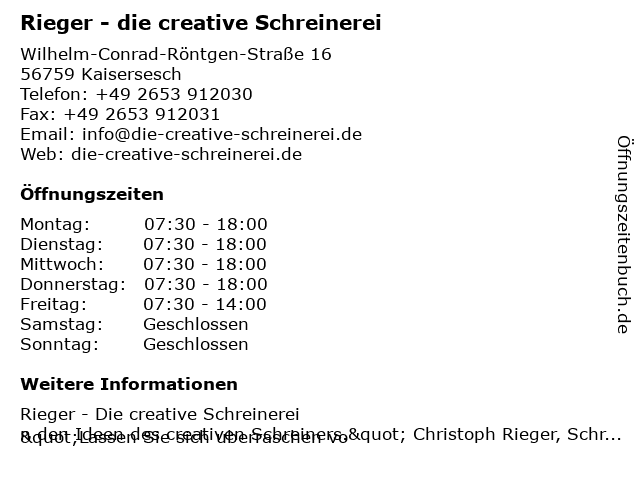 1 Christoph Rieger Schreinerei Holzfachmarkt (Entfernung: 1,59 km) Wilhelm-Conrad-Röntgen-Str. 10, 56759 Kaisersesch 6 |
