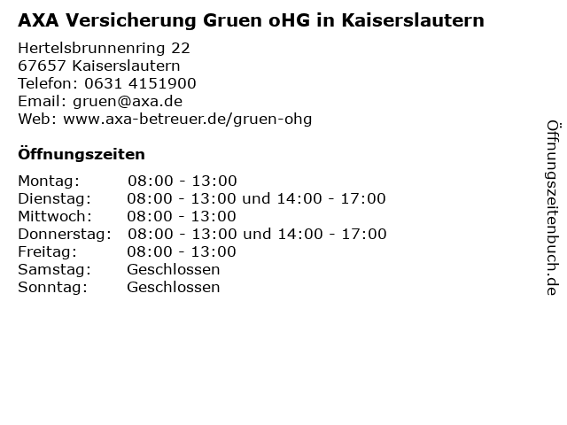 1 AXA & DBV Versicherung Thomas Summer Kaiserslautern (Entfernung: 1,58 km) Bismarckstraße 22, 67655 Kaiserslautern 2 AXA Versicherung - Bezirksdirektion Thomas Kallenbach (Entfernung: 2,20 km) Eisenbahnstr. 60, 67655 Kaiserslautern 3 AXA Versicherung - Hauptvertretung Richard Parr (Entfernung: 2,31 km) Obstwiese 4, 67659 Kaiserslautern 5 AXA Versicherung - Generalvertretung Walter Scharding (Entfernung: 9,94 km) Mühlstr. 23, 67699 Schneckenhausen 6 |