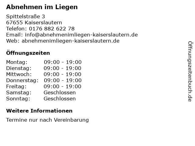 | Öffnungszeiten Abnehmen im Liegen in Kaiserslautern anzeigen | |