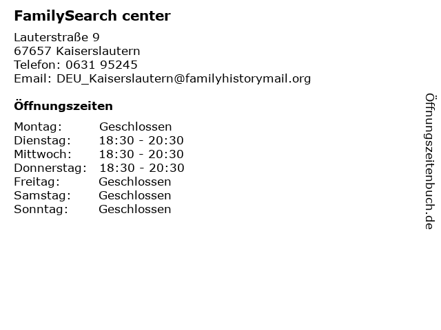| Öffnungszeiten FamilySearch center in Kaiserslautern anzeigen | |