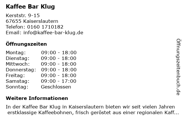 | Öffnungszeiten Kaffee Bar Klug in Kaiserslautern anzeigen | |