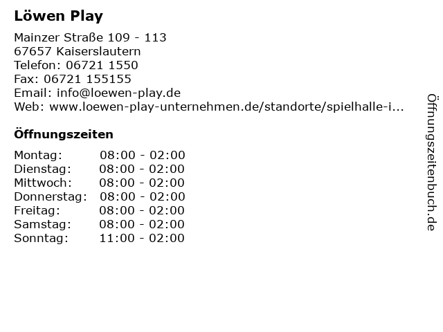 | Öffnungszeiten Löwen Play in Kaiserslautern anzeigen | |