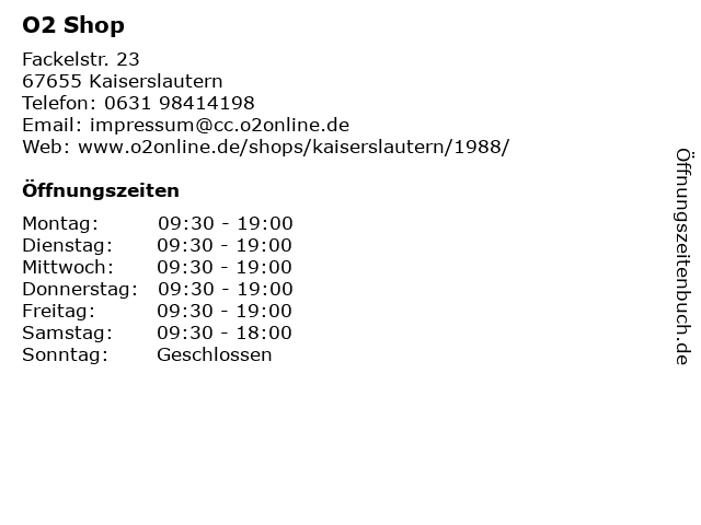 | Öffnungszeiten O2 Shop in Kaiserslautern anzeigen | |