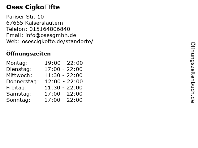 | Öffnungszeiten Oses Cigköfte in Kaiserslautern anzeigen | |
