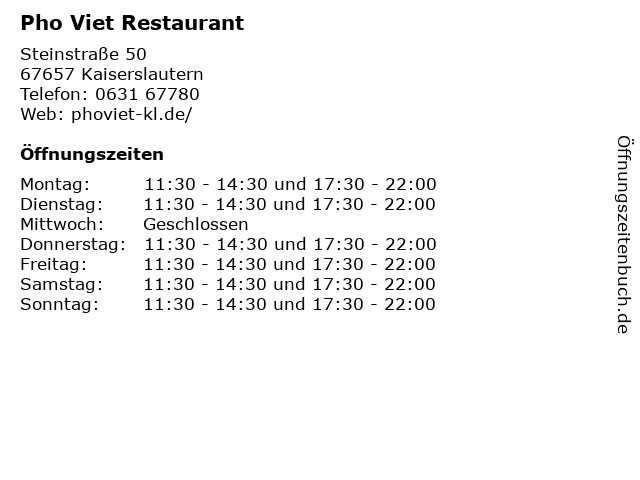 | Öffnungszeiten Pho Viet Restaurant in Kaiserslautern anzeigen | |
