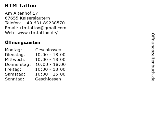| Öffnungszeiten RTM Tattoo in Kaiserslautern anzeigen | |