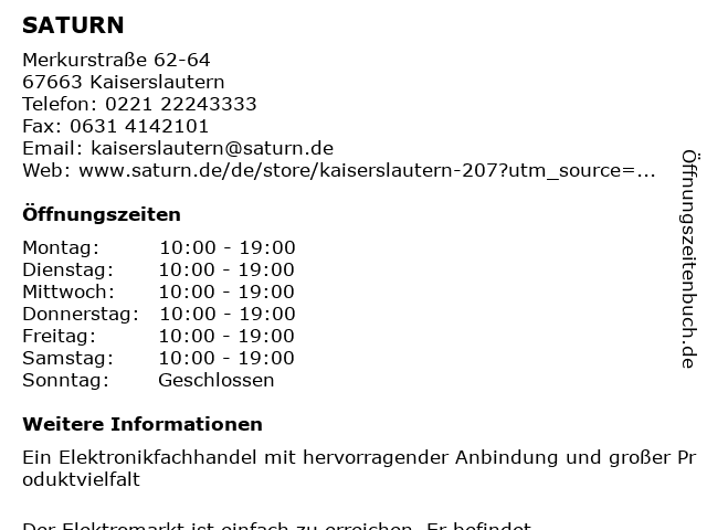 | Öffnungszeiten SATURN in Kaiserslautern anzeigen | |
