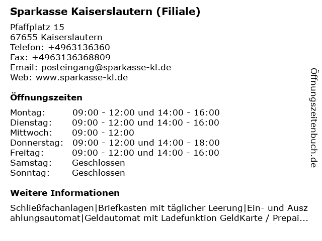 1 Sparkasse Kaiserslautern (BeratungsCenter) (Entfernung: 1,04 km) Stiftsplatz 10, 67655 Kaiserslautern 4 Sparkasse Kaiserslautern (BeratungsCenter) (Entfernung: 11,24 km) Hauptstraße 16, 67677 Enkenbach-Alsenborn 6 Sparkasse Kaiserslautern (BeratungsCenter) (Entfernung: 14,77 km) Landstuhler Straße 6, 66877 Ramstein-Miesenbach |