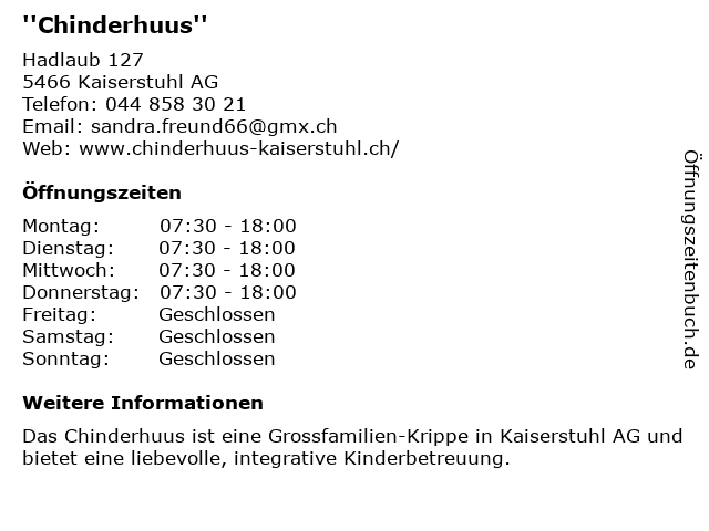 | Öffnungszeiten ''Chinderhuus'' in Kaiserstuhl AG anzeigen | |