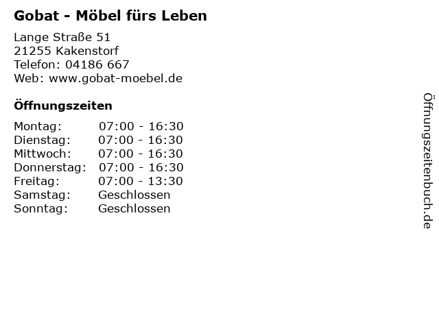 | Öffnungszeiten Gobat - Möbel fürs Leben in Kakenstorf anzeigen | |