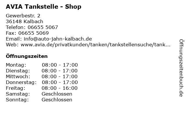 | Öffnungszeiten AVIA Tankstelle - Shop in Kalbach anzeigen | |