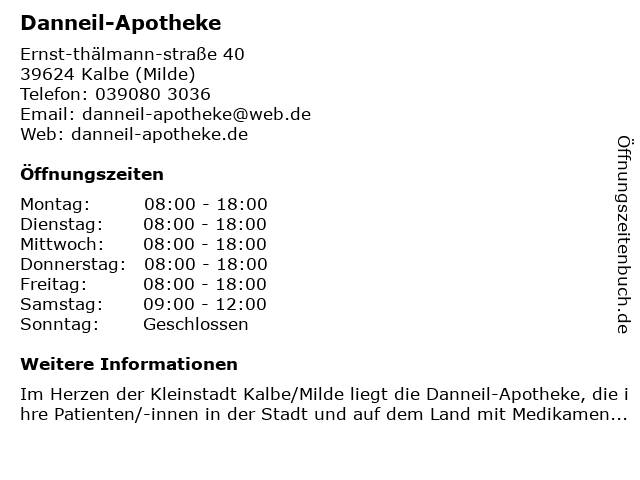 | Öffnungszeiten Danneil-Apotheke in Kalbe (Milde) anzeigen | |