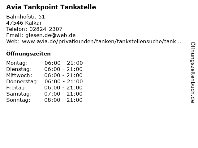 | Öffnungszeiten Avia Tankpoint Tankstelle in Kalkar anzeigen | |