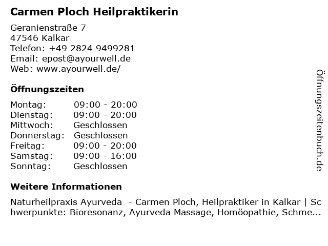 | Öffnungszeiten Carmen Ploch Heilpraktikerin in Kalkar anzeigen | |