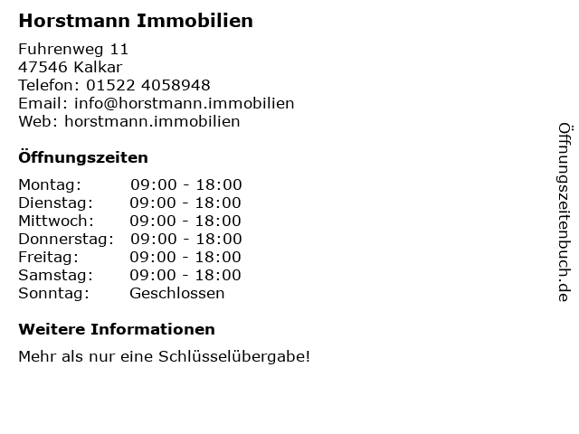 | Öffnungszeiten Horstmann Immobilien in Kalkar anzeigen | |