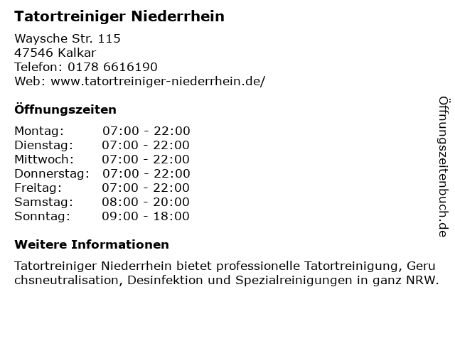 | Öffnungszeiten Tatortreiniger Niederrhein in Kalkar anzeigen | |