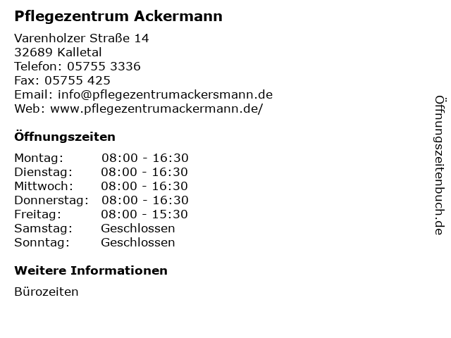 | Öffnungszeiten Pflegezentrum Ackermann in Kalletal anzeigen | |