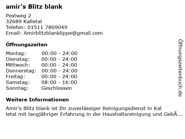 | Öffnungszeiten amir's Blitz blank in Kalletal anzeigen | |