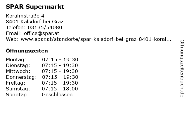 | Öffnungszeiten SPAR Supermarkt in Kalsdorf bei Graz anzeigen | |