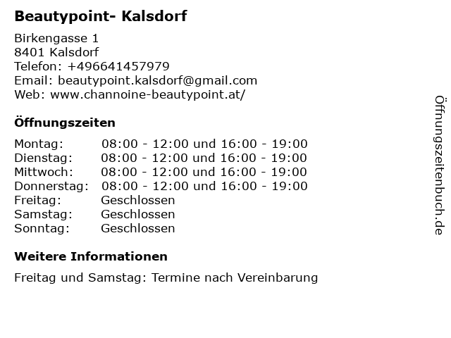 | Öffnungszeiten Beautypoint- Kalsdorf in Kalsdorf anzeigen | |