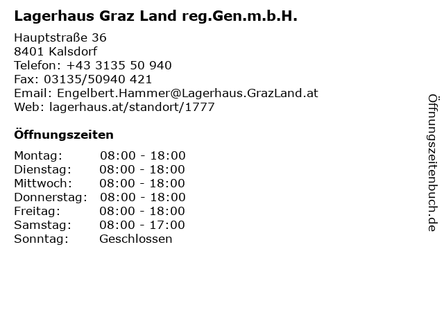 1 Lagerhaus Graz Land reg.Gen.m.b.H. - Genol Tankstelle (Entfernung: 0,07 km) Hauptstraße 36, 8401 Kalsdorf 2 Lagerhaus Graz Land reg.Gen.m.b.H. - Haus & Garten,Brennstoffe (Entfernung: 3,42 km) Fernitzer Straße 4, 8071 Hausmannstätten 6 |
