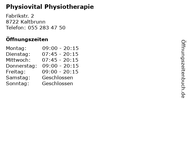 | Öffnungszeiten Physiovital Physiotherapie in Kaltbrunn anzeigen | |