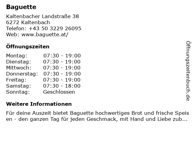 | Öffnungszeiten Baguette in Kaltenbach anzeigen | |