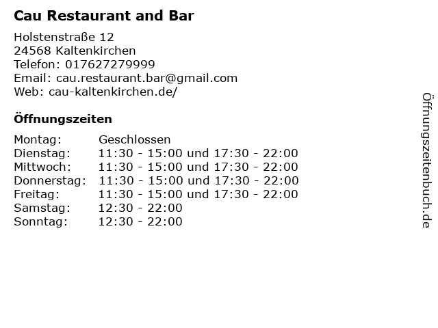 | Öffnungszeiten Cau Restaurant and Bar in Kaltenkirchen anzeigen | |