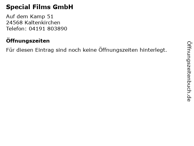 | Öffnungszeiten Special Films GmbH in Kaltenkirchen anzeigen | |
