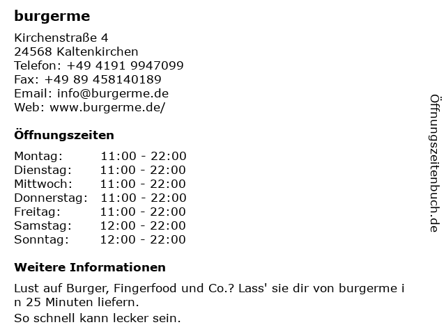 | Öffnungszeiten burgerme in Kaltenkirchen anzeigen | |