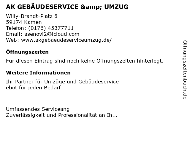 | Öffnungszeiten AK GEBÄUDESERVICE & UMZUG in Kamen anzeigen | |