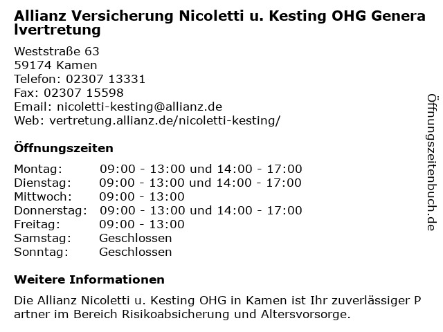 1 Allianz Versicherung Nicoletti u. Kesting OHG Generalvertretung (Entfernung: 14,78 km) Meinbergstraße 69, 44269 Dortmund 3 Allianz Versicherung Dirk Riechers Generalvertretung (Entfernung: 3,28 km) Werner Straße 160, 59192 Bergkamen 4 Allianz Versicherung - Generalvertretung Dirk Riechers (Entfernung: 9,49 km) Grevinghof 65a, 59368 Werne 5 Generalvertretung Werner Heinrichs Allianz Versicherungsagentur (Entfernung: 10,28 km) Dortmunder Str. 24 A, 44536 Lünen 6 |