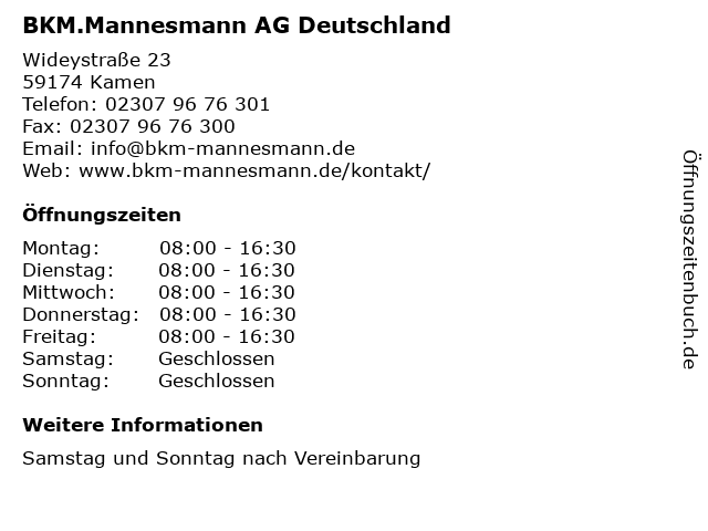 | Öffnungszeiten BKM.Mannesmann AG Deutschland in Kamen anzeigen | |