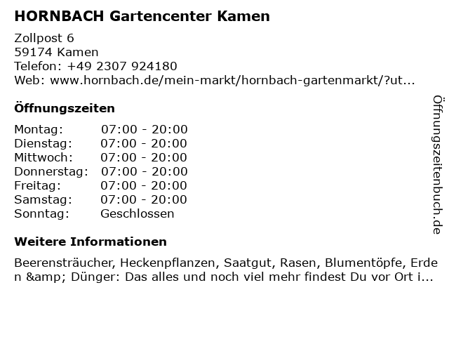 | Öffnungszeiten HORNBACH Gartencenter Kamen in Kamen anzeigen | |