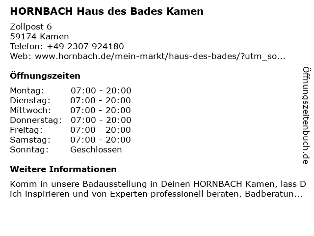 | Öffnungszeiten HORNBACH Haus des Bades Kamen in Kamen anzeigen | |