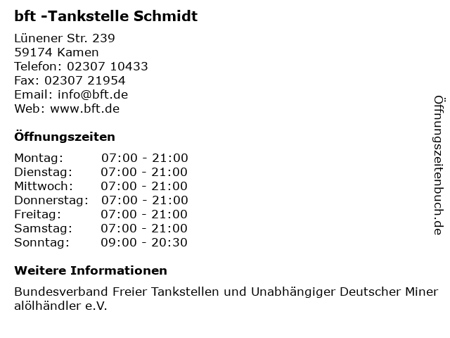 | Öffnungszeiten bft -Tankstelle Schmidt in Kamen anzeigen | |