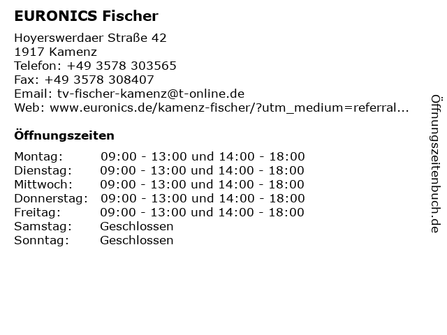 | Öffnungszeiten EURONICS Fischer in Kamenz anzeigen | |