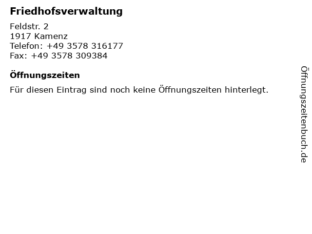 | Öffnungszeiten Friedhofsverwaltung in Kamenz anzeigen | |