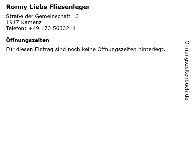 | Telefonnummer Ronny Liebs Fliesenleger in Kamenz (+49 173 5633214) anrufen | |