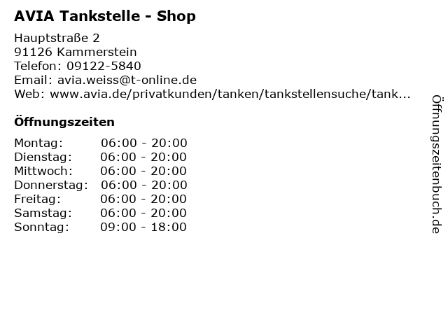 | Öffnungszeiten AVIA Tankstelle - Shop in Kammerstein anzeigen | |