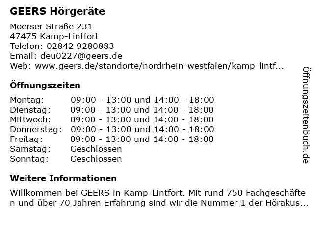 | Öffnungszeiten GEERS Hörgeräte in Kamp-Lintfort anzeigen | |