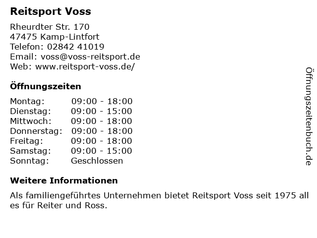3 Reitsport Plus: Plus in Qualität, Minus im Preis (Entfernung: 13,28 km) Kirchstrasse 72, 47119 Duisburg 4 HBS Voss Heinrich Voss Haus + Boden Sachwertanlagen GmbH (Entfernung: 13,58 km) Ottostr. 58 -60, 47198 Duisburg 6 Stewes Landhandel Fressnapf, EQUIVA Reitsport Zoohandlung, Tierbedarf, Reitsport (Entfernung: 18,21 km) Max-Eyth-Straße 9, 46539 Dinslaken |