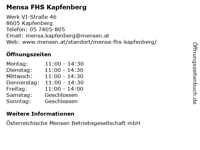 Öffnungszeiten Mensa FHS Kapfenberg in Kapfenberg anzeigen | |