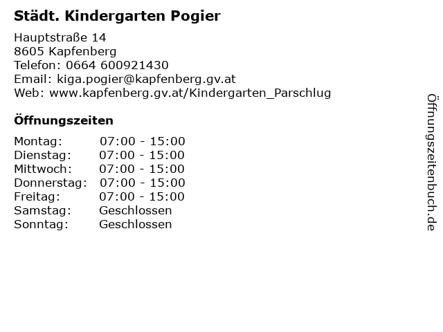 2 3 Städt. Kindergarten Kapfenberg Diemlach (Entfernung: 1,57 km) Gustav-Kramer-Straße 29, 8605 Kapfenberg 5 Städt. Kindergarten Kapfenberg Walfersam (Entfernung: 2,35 km) Karl-Heinrich-Waggerl-Weg 8, 8605 Kapfenberg 6 |